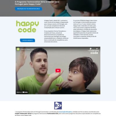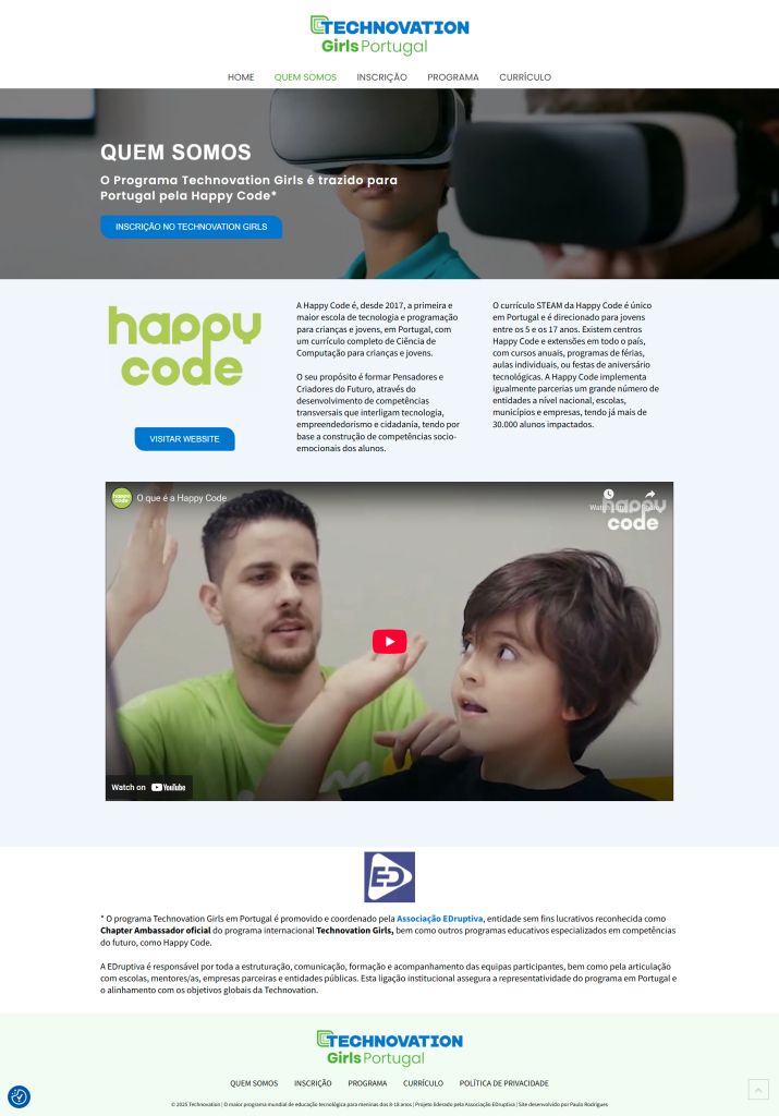 Fomos desafiados a desenvolver o novo site do programa Technovation Girls em Portugal, promovido e coordenado pela Associação EDruptiva, entidade sem fins lucrativos reconhecida como Chapter Ambassador oficial do programa internacional Technovation Girls, bem como outros programas educativos especializados em competências do futuro, como Happy Code.